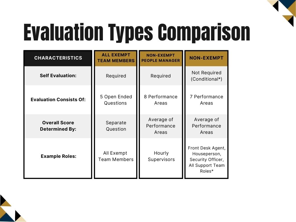 • For non-exempt (hourly) Team Members, only those in leadership or support roles are required to complete a self-evaluation. Frontline hourly roles—such as front desk agents, housekeepers, engineering techs, security officers, and similar positions—are not required to submit a self-evaluation.