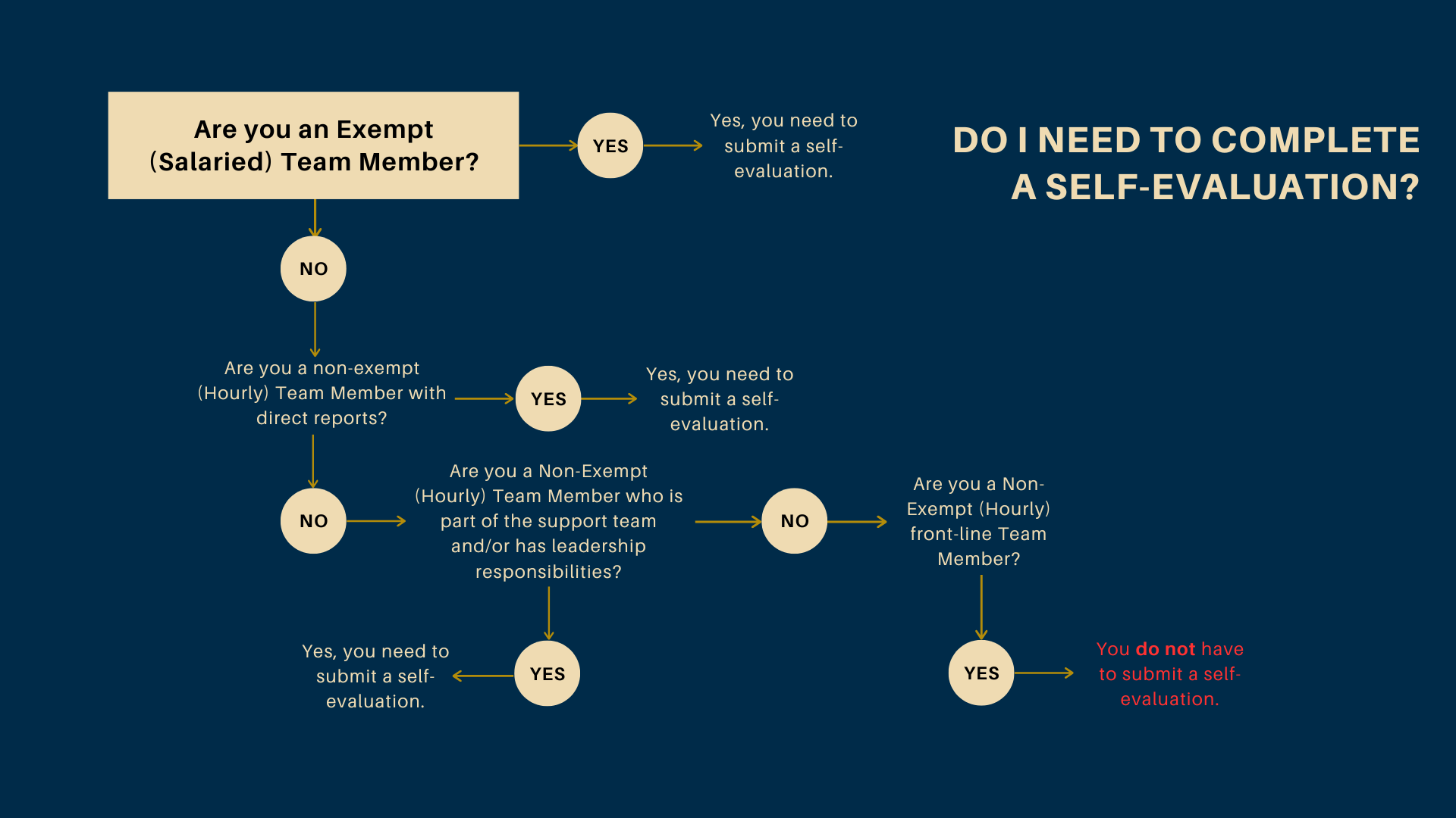 • For non-exempt (hourly) Team Members, only those in leadership or support roles are required to complete a self-evaluation. Frontline hourly roles—such as front desk agents, housekeepers, engineering techs, security officers, and similar positions—are not required to submit a self-evaluation.